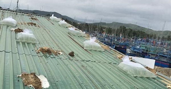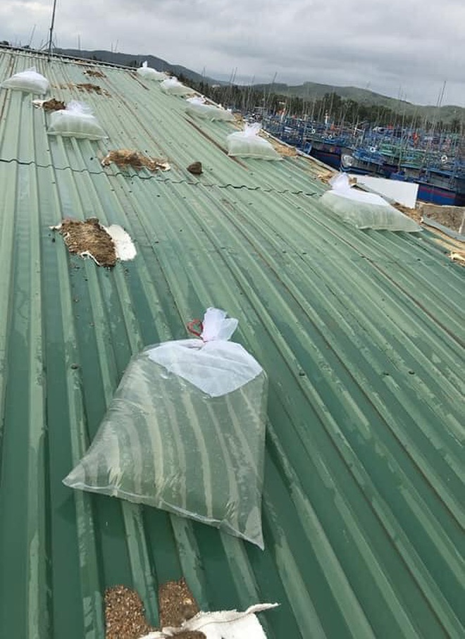 Nhiều bao nước đã được đặt trên nóc nhà tôn để ngăn tốc mái khi gió lớn. Anh Sơn – người dân phường Tam Quan Bắc chia sẻ: "Nghe thông tin dự báo cơn bão này rất mạnh nên chúng tôi cũng không chủ quan, khẩn trương chằng chống nhà cửa chứ sợ tốc mái lắm. Ở đây có nhiều nhà xây kiểu mới, lợp mái tôn nên phải chằng chống cho cẩn thận".