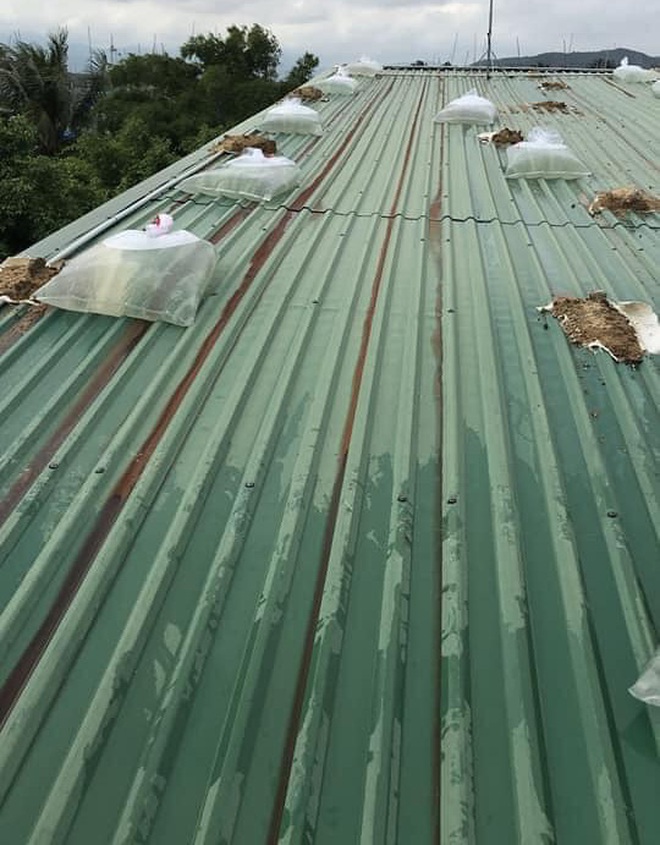 Bơm nước vào bao nilon, đặt trên nóc nhà để ngăn tốc mái (Ảnh: MK)