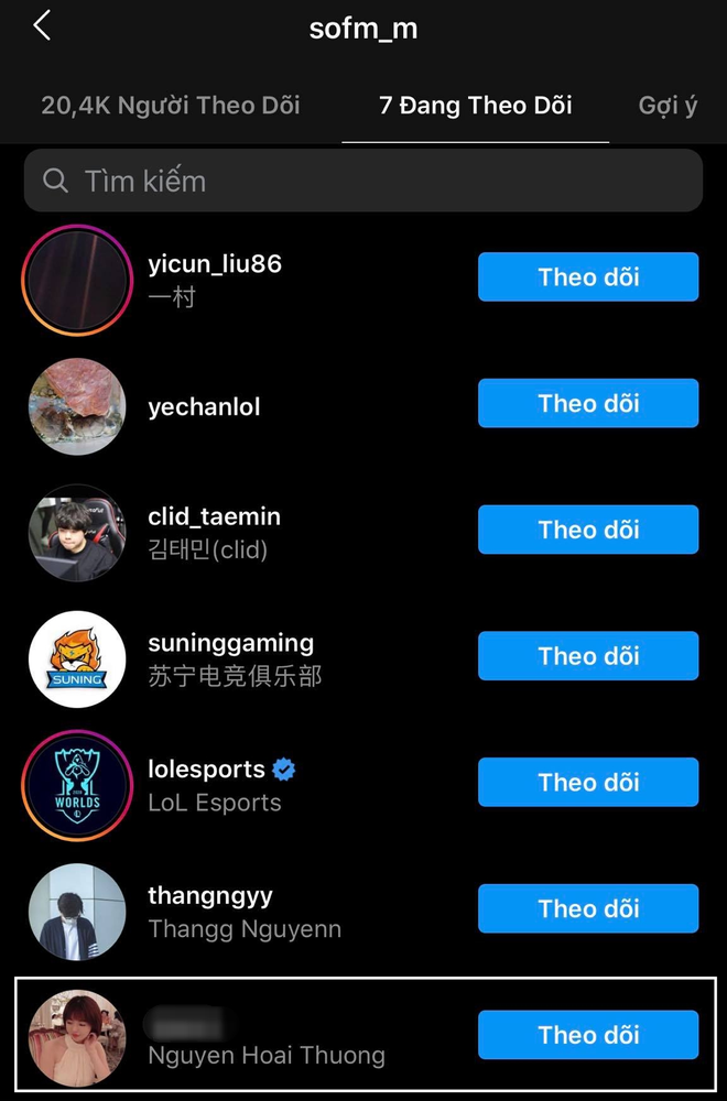 Trên Instagram, chàng game thủ đình đám follow vỏn vẹn 7 account, trong đó duy nhất Lily là con gái, còn lại là đồng đội và IG của team Suning. Hoá ra SofM đã âm thầm là thành viên hội "follow mình em" từ bao giờ rồi nè!