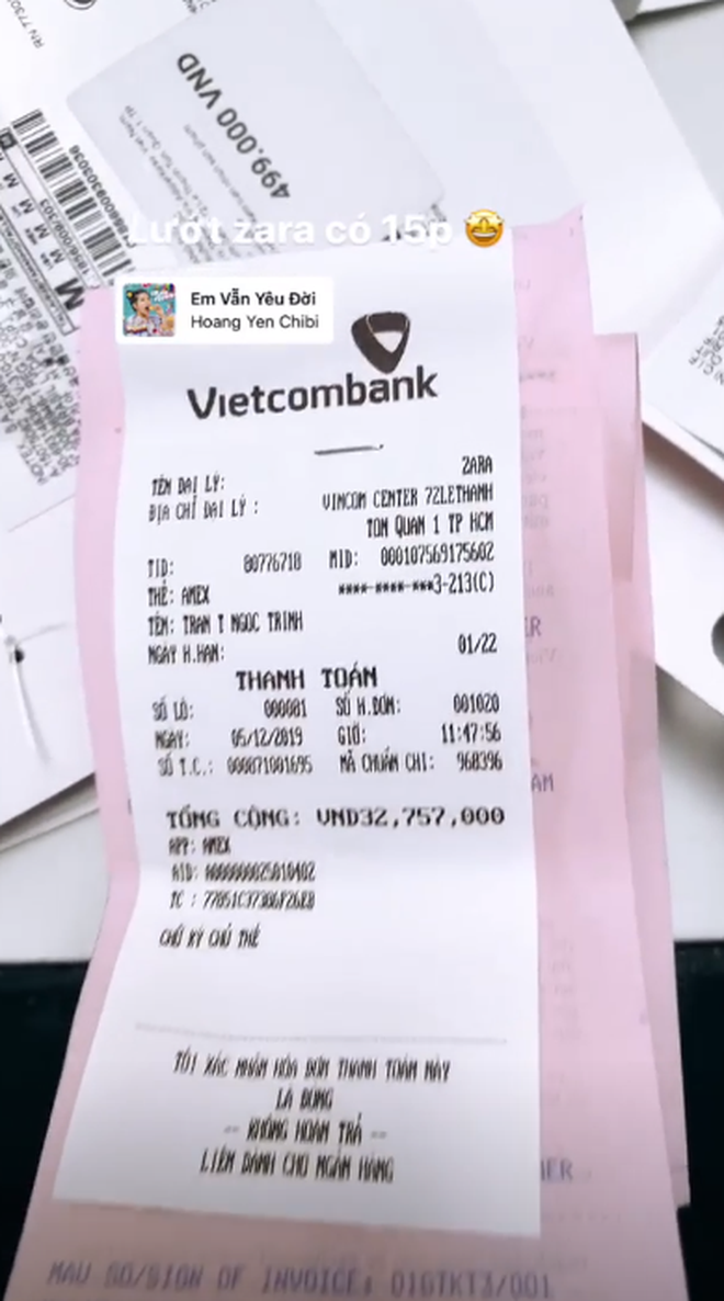 Trước đó, Ngọc Trinh cũng từng khoe chiến tích khi chỉ vào Zara 15 phút mà mua hết 33 triệu tiền đồ.