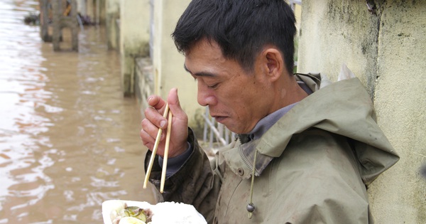 Nhận những chiếc bánh chưng cứu trợ, ông Bùi Quang Việt (trú xã Cẩm Duệ) và vợ đứng trên tầng 2 bóc ăn. Do nhà ngập sâu trong lũ nên không thể nấu nướng gì. Sinh hoạt 3 ngày qua đều nhờ vào các đoàn từ thiện giúp đỡ.