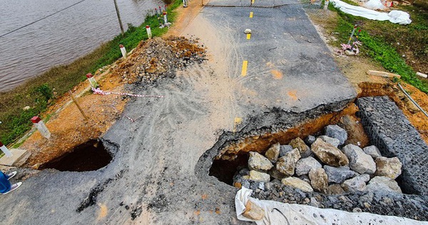 Nhiều mặt đường trên tuyến quốc lộ chạy qua địa phận thôn Lệ Xuyên, xã Triệu Trạch, huyện Triệu Phong bị lũ tàn phá nghiêm trọng. Trong ảnh: Cả mảng lớn đường bị bong tróc và sụt lún gây nguy hiểm cho các phương tiện giao thông