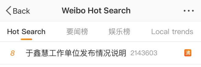 Hiện tại sự việc Vu Hâm Tuệ tiếp tục trở thành chủ đề được quan tâm nhất trong ngày 18/10 trên MXH Weibo.