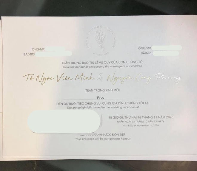 Ngày 16/11 tới đây, Công Phượng sẽ chính thức về chung một nhà với bà xã Viên Minh (tên đầy đủ là Tô Ngọc Viên Minh, SN 1993). Dù chỉ còn 10 ngày nữa đám cưới của Công Phượng sẽ diễn ra nhưng thứ duy nhất người ta biết được vỏn vẻn là "tấm thiệp mời trên bàn, thời gian địa điểm rõ ràng" nên dân tình càng háo hức hóng hớt hơn bao giờ hết.