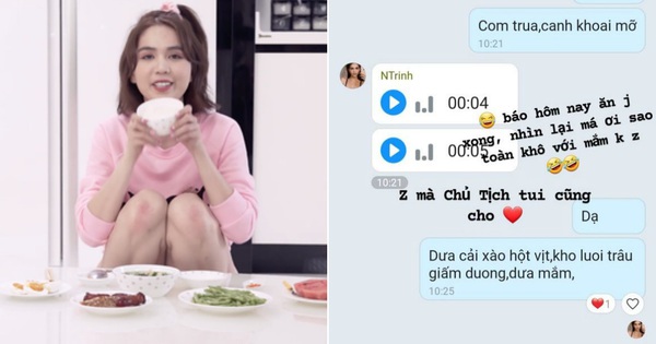 Mới đây, trên story Instagram của mình, nữ trợ lý Thuý Kiều đã đăng tải đoạn tin nhắn trao đổi với Ngọc Trinh về bữa cơm trưa tại nhà. Trong đó, cô tiết lộ bên cạnh sò huyết, bữa cơm trưa sẽ bao gồm những món đạm bạc như: canh khoai mỡ, dưa cải xào hột vịt, khô lưỡi trâu giấm đường, dưa mắm…