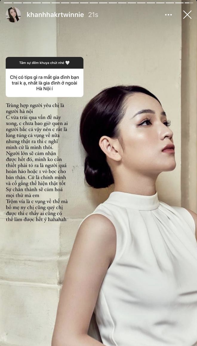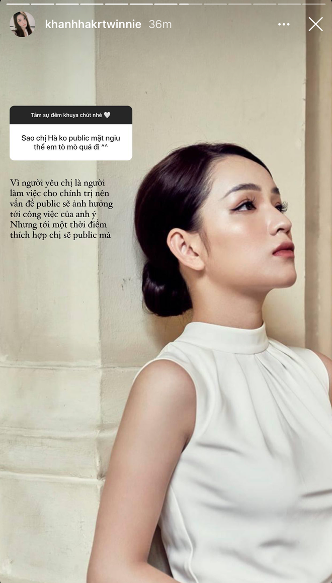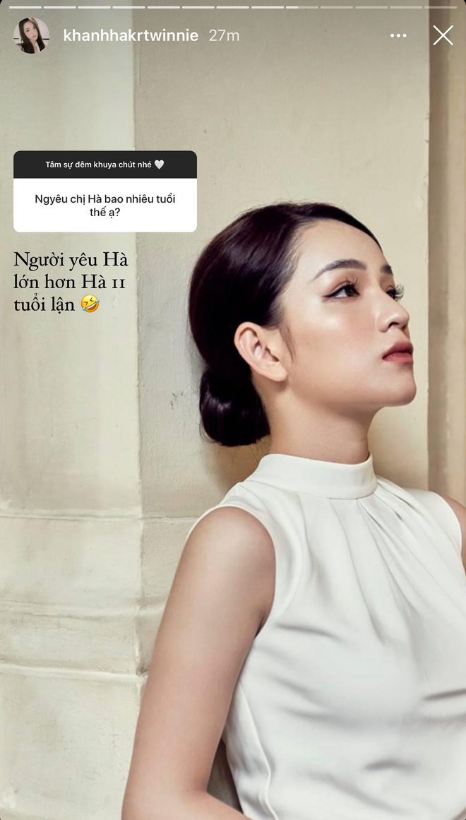 Mới đây nhất, Khánh Hà vừa tiết lộ hàng loạt những chi tiết về chuyện tình của mình trên Instagram thông qua trò Q&A cùng fan. Theo đó, người mới của nàng tiểu thư hơn cô tới 11 tuổi, là người Hà Nội