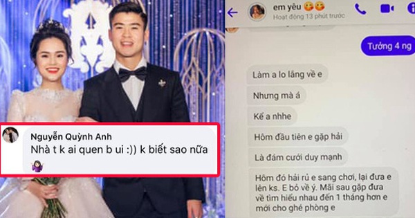 Dưới bài đăng trên Facebook cá nhân Duy Mạnh, dân tình spam bức ảnh chụp đoạn tin nhắn với nội dung: "Kể anh nhé. Hôm đầu tiên em gặp Hải. Là đám cưới Duy Mạnh. Hôm đó Hải rủ em sang chơi, lại đưa em lên khách sạn. Em bỏ về ý. Mãi sau gặp đưa về tìm hiểu nhau đến 1 tháng hơn em mới cho ghé phòng em"...