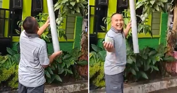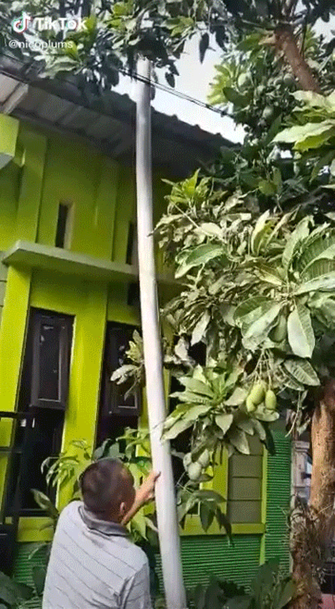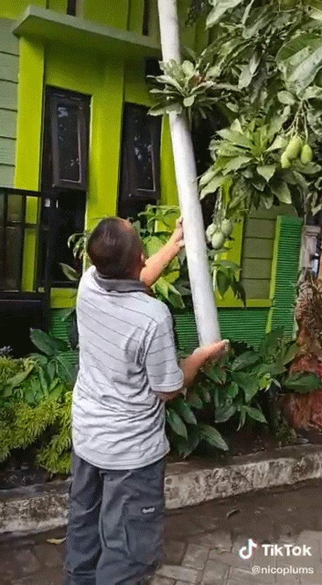 Có thể thấy, người đàn ông này đã dùng một chiếc ống nhựa lớn để hái xoài. Việc cần làm chỉ là khéo léo đưa quả xoài vào bên trong ống và giật đứt cuống. Trái xoài sẽ theo đường ống rơi xuống và chúng ta chỉ cần đỡ tay ở miệng ống là đã có luôn thành quả một cách nhanh, gọn, lẹ mà xoài không bị rơi xuống đất dập vỡ, lại cũng chẳng tốn kém tiền mua flycam hay ô tô. Bảo sao mà cư dân mạng không trầm trồ được chứ!
