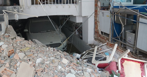 Phần phía trước căn nhà quán bún đã bị đổ sập, nhiều vật dụng văng tứ tung hư hỏng, trong đó có một ô tô. Vụ nổ cũng khiến phần tường và cổng nhà bên cạnh bị hư hỏng.