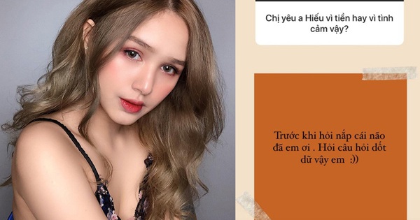 Mới đây, trên story Instagram, Xoài Non vừa "bật" lại khá gay gắt khi bị hỏi về nguyên nhân kết hôn của mình. Cụ thể, tài khoản này đã đặt thẳng vấn đề với cô nàng khi hỏi: "Chị yêu anh Hiếu vì tiền hay vì tình cảm vậy?"