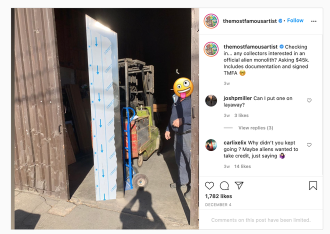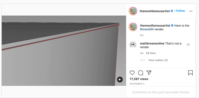 Và thậm chí, tác giả của chúng có vẻ cũng đã xuất hiện. Matty Mo - người tự nhận mình là "Nghệ sĩ nổi tiếng nhất" đã đăng rất nhiều hình ảnh về monolith trên trang web cá nhân của mình, kèm theo nhiều tác phẩm khá nổi bật khác nữa. Dù không chắc chắn 100%, nhưng chính Matty Mo đã tự nhận mình là tác giả của số monolith ấy trên Instagram, kèm theo mức giá bán ra là 45.000 USD cùng bản thiết kế gốc của chúng.