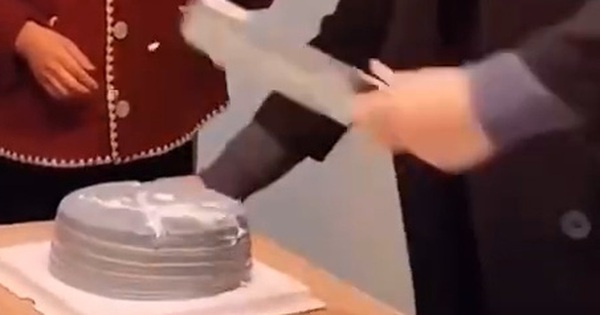Nhìn người bạn của mình cắt quá lề mề, chủ nhân bữa tiệc đã dùng dao phay để "băm" chiếc bánh sinh nhật một cách dứt khoát.