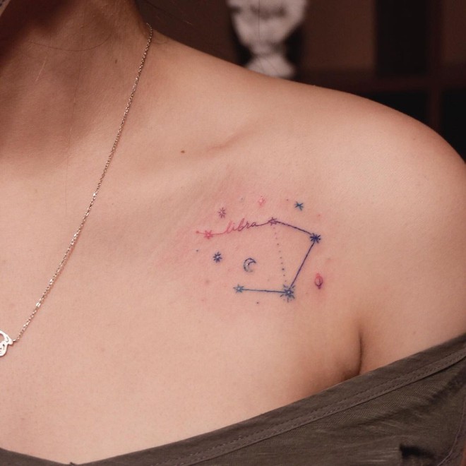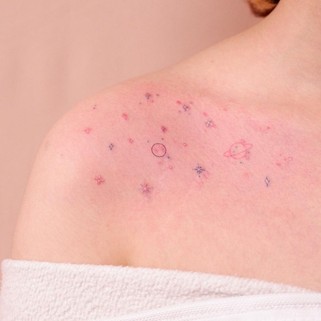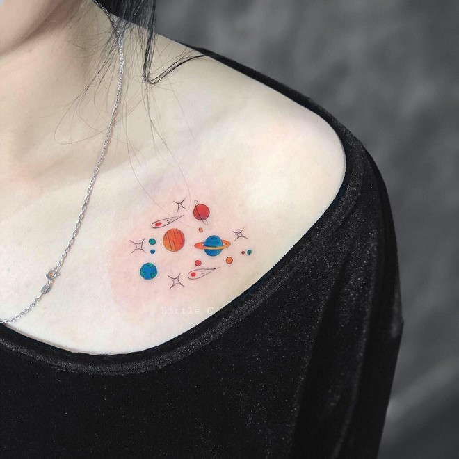 Những hình xăm màu cầu vồng kiểu chòm sao, hành tinh đầy mơ mộng cũng được các cô gái chưng diện đầy cả ra. Và bạn có thể tìm đến Vicenter Tattoo để "chơi" một hình cho mới mẻ, đón mùa lễ hội và năm mới sắp đến.