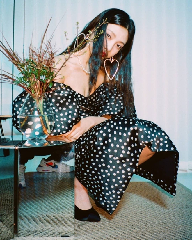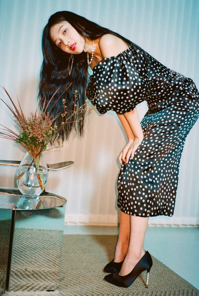 Joy cũng từng diện mẫu váy này, cô mix váy cùng giày cao gót mũi nhọn, đeo khuyên tai to bản, kiểu tóc rẽ ngôi đơn giản.