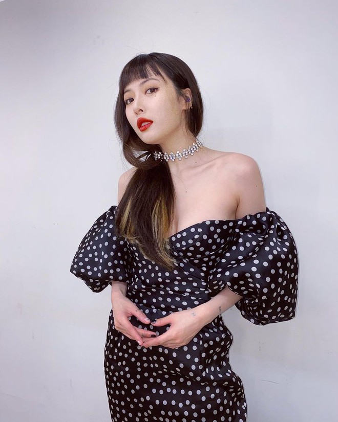Hyuna lại mang đến hình ảnh cá tính khi mix váy cùng boots cao cổ, cố tình đeo vòng tròng qua ngoài tóc để tạo sự nổi bật.