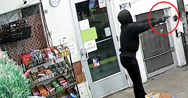 Tên cướp đeo mặt nạ, mang theo súng xông vào cửa hàng và chĩa thẳng về phía những người có mặt bên trong
