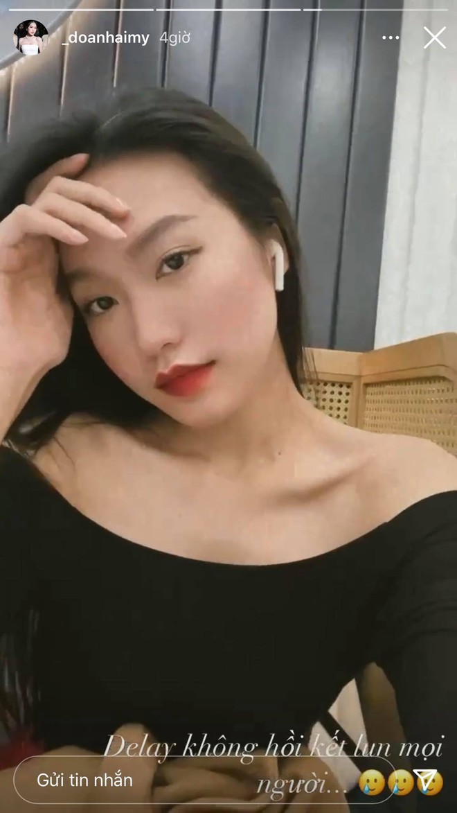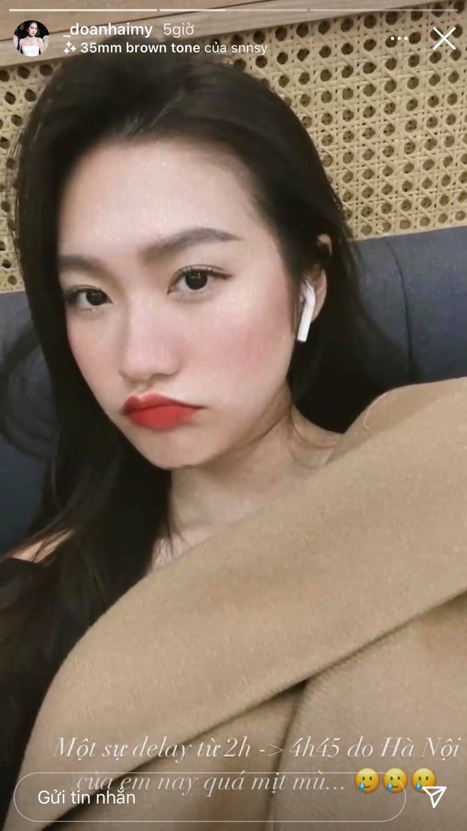 Doãn Hải My - top 10 Hoa hậu Việt Nam bay từ Hà Nội vào TP.HCM dự Gala nhưng lại gặp thời tiết xấu nên chuyến bay bị delay gần 3 tiếng đồng hồ. Tuy nhiên, điều đáng chú ý là dù hơi uể oải vì phải chờ đợi nhưng cô nàng vẫn giữ nguyên vẹn phong độ nhan sắc.