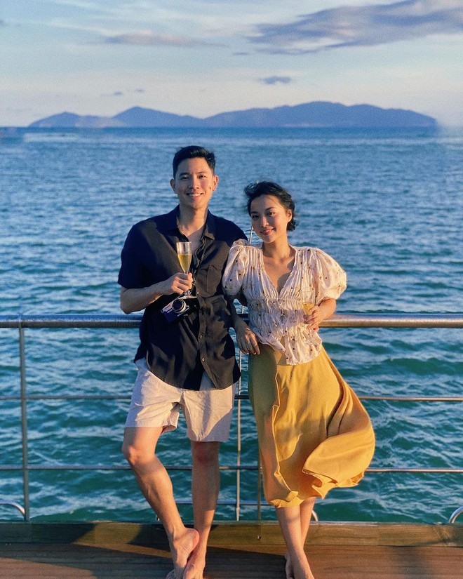 Háo hức không kém là travel blogger Lê Hà Trúc. Cô nàng còn quyết tâm chặt chém thảm đỏ với đôi giày cao gót 14cm để ăn gian khoản chiều cao. Đây cũng là lần đầu tiên Hà Trúc và Quang Đạt công khai dự event với tư cách couple nên hồi hộp cũng phải.