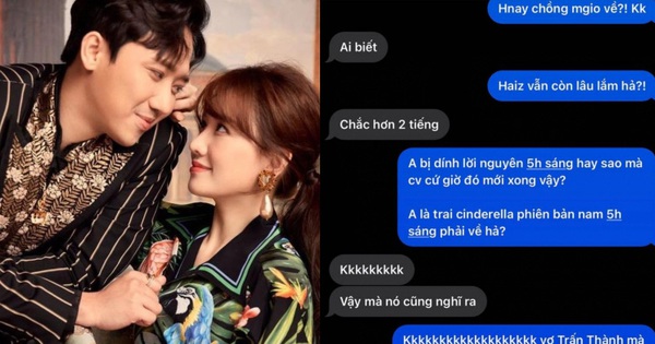 Đến đây, Hari Won "nổi đoá": "Anh bị dính lời nguyền 5 giờ sáng hay sao mà công việc giờ đó mới xong vậy? Anh là trai Cinderella phiên bản nam 5 giờ sáng mới phải về hả?". Cách bà xã Trấn Thành "mắng yêu" khiến ai nấy đều phải bật cười. Nhận được tin nhắn từ vợ, Trấn Thành nhanh chóng có phản ứng "cạn lời" bởi độ hài hước vô hạn của bà xã. Qua đoạn tin nhắn của Hari Won và Trấn Thành cũng đủ cảm nhận được cặp đôi đang viên mãn và hạnh phúc vô cùng.