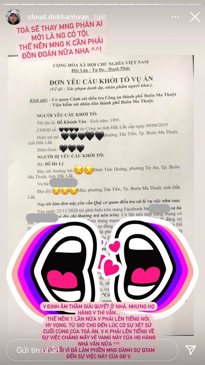 Cũng trong thời gian group anti xuất hiện, dân tình mới biết Khánh Vân và họ hàng có mâu thuẫn rất lớn về việc phân chia tài sản. Ngày 10/1 vừa qua, Khánh Vân cho biết mình đã chính thức đâm đơn kiện họ hàng về tội "Xúc phạm danh dự, nhân phẩm người khác", đồng thời cũng chia tin này công khai trên trang cá nhân. Hôm nay (11/1), Khánh Vân và họ hàng của mình sẽ ra tòa để giải quyết về vấn đề này.