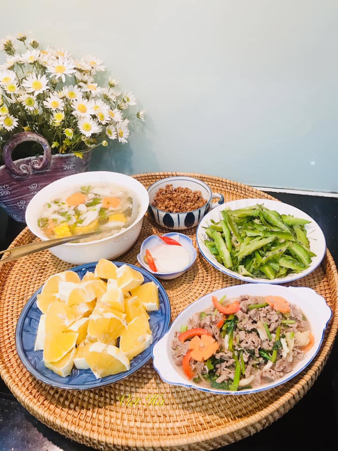 "Trong một mâm cơm, mình luôn chú trọng cân đối cả về dinh dưỡng, thay đổi món cho đỡ chán. Mình cũng thích trang trí mâm cơm đẹp một chút nhưng cần đơn giản và mất ít thời gian nhất có thể", chị vợ đảm chia sẻ.