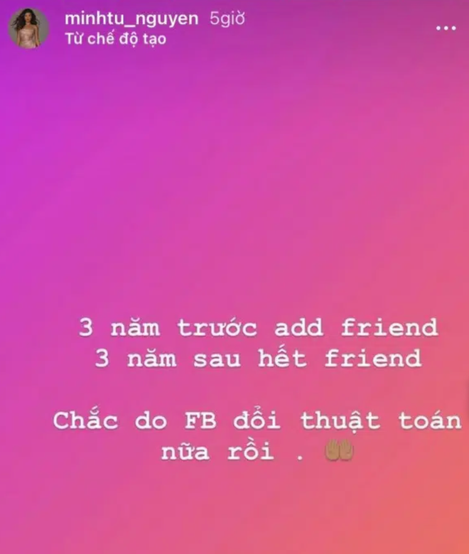 "Drama queen" đầu năm 2021 gọi tên Minh Tú, cô liên tục bị gọi tên vào những ồn ào không hồi kết. Được biết, Minh Tú và Hoàng Thùy đã cãi nhau căng đét trên sóng truyền hình sau 1 phần thi của thí sinh tại Đại Sứ Hoàn Mỹ 2020. Ngay sau đó, Minh Tú ẩn ý đã unfriend "cạch mặt" một người vừa kết bạn cách đây 3 năm. Đáng nói, 3 năm trước cũng là thời điểm Minh Tú liên tục vướng lùm xùm với Hoàng Thùy và Kỳ Duyên.
