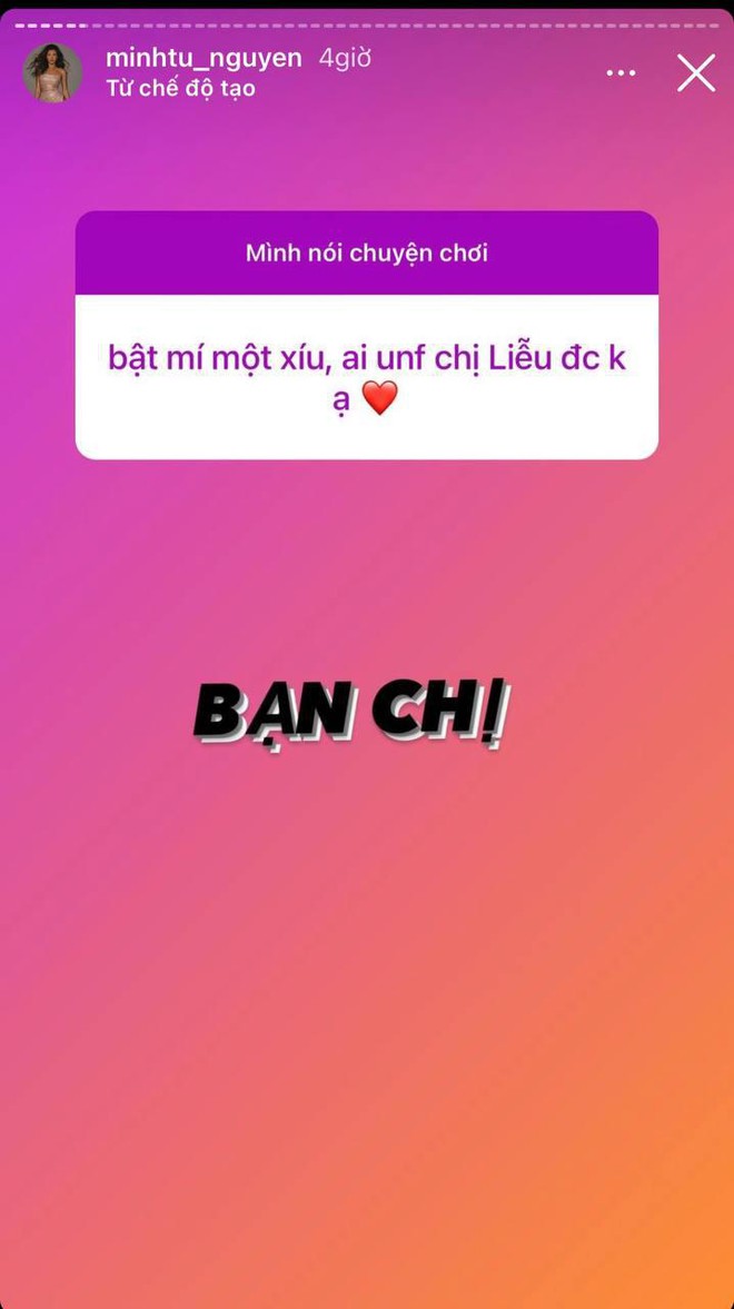 Tuy nhiên, sau đó không lâu, Minh Tú và Hoàng Thuỳ lại thân thiết "chị chị em em". Thậm chí, Hoàng Thuỳ còn yêu cầu kết bạn Facebook và cùng nhau đi ăn phi lê cá