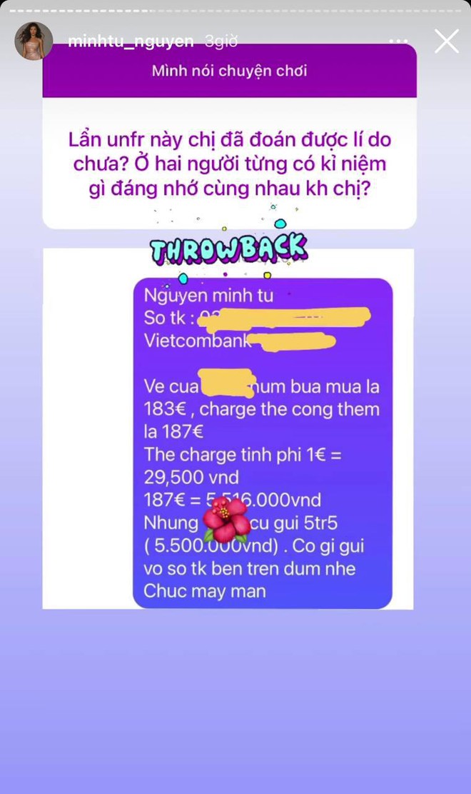 Cho đến rạng sáng ngày 4/1, Minh Tú đã có những trải lòng gây chú ý với người hâm mộ khi được đặt 1 loạt câu hỏi. Theo lời nữ siêu mẫu, cô vừa "cạch mặt" 1 người bạn thân thiết, kỷ niệm cuối cùng của cả 2 là tin nhắn chuyển tiền vé bay. Đáng nói, khi bị netizen so sánh với Hoàng Thuỳ, Minh Tú vội đáp lại bằng 1 câu sưu tầm trên mạng. Cụ thể, Minh Tú chia sẻ: "Đừng so sánh mình với bất kì ai trong thế giới này. Nếu làm như vậy có nghĩa là bạn đang sỉ nhục chính bản thân mình". Động thái này của Minh Tú khiến netizen cho rằng cô không hài lòng khi bị gọi tên và so sánh với Hoàng Thùy trong thời điểm này.