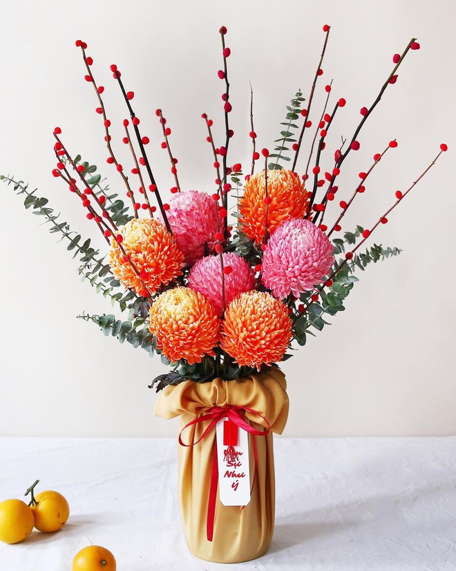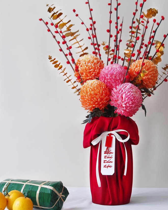 Sắm bình hoa tết mà ghé Qualá thì khỏi sợ đụng hàng vì bình được thiết kế riêng, vừa sang, vừa nịnh mắt. Bình hoa gồm cúc mẫu đơn nở to nhiều màu, kết hợp nụ tầm xuân đỏ, lá bạc lá vàng và được bọc vải tinh tế hết sức. Đặt một bình ở phòng khách thì không khí Tết ngập tràn, tạo nên mới mẻ, tươi vui, giúp nhà có thêm điểm nhấn. Hoa được tiệm cắm sẵn, cam kết bền tối thiểu 7 ngày nên nếu bạn có ý định mua trưng Tết, hãy canh thời gian chuẩn rồi mua nha! Sản phẩm có 3 size M, L và XL với giá từ 695k - 1090k.