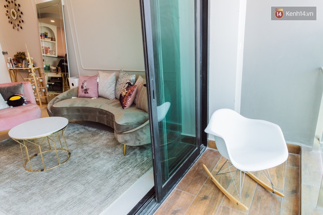 Nội thất trong phòng nhìn qua rất "ăn nhập" với nhau về khoản màu sắc. Tuy nhiên, Ngọc Thảo kể đa số cô phải mua rời, tìm từng món, lựa từng màu thật kĩ để về decor chứ không phụ thuộc vào bên thiết kế. Như sofa trong phòng khách, Ngọc Thảo cố tình chọn kiểu sofa cong để bạn bè có thể dễ dàng tương tác khi trò chuyện. Ngoài ra, cô cũng bày biện thêm loạt gối sofa vuông, đa dạng chất liệu, loại trơn, loại đính kim sa óng ánh để tạo điểm nhấn cho căn phòng rất có chất con gái luôn.
