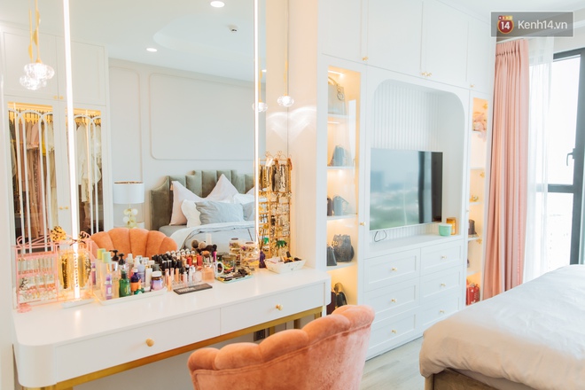 Phòng ngủ của Ngọc Thảo cũng có view "ổn áp". Phòng không quá rộng nhưng ấm cúng. Đối diện giường ngủ là tivi, kệ trắng chạm trần để đặt túi hiệu, balo. Bàn trang điểm sát tủ gây chú ý với đồ makeup, trang sức bạt ngàn. Nội thất phòng ngủ có tông trắng chủ đạo nên mang đến nét tinh tế, nhẹ nhàng. Ngọc Thảo chia sẻ: "So với nhiều nghệ sĩ khác, phòng ngủ, tủ quần áo, bàn trang điểm của mình chỉ khiêm tốn thôi, nhưng mình lại thấy rất thoải mái với chốn riêng tư này, vì nó phù hợp với một người độc thân như mình ấy".