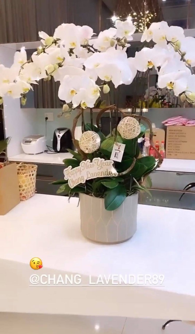 “Khu vườn” nhà Ngọc Trinh có hoa đào, hoa mai, các loại lan từ trắng, vàng tới điểm tím, vài chậu cúc, vài cành hoa vàng cắm lọ trên bàn ăn… Số hoa này phần lớn là từ những đối tác, bạn bè tặng Ngọc Trinh nhân dịp năm mới.
