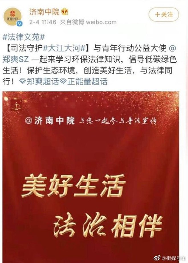 Netizen xứ Trung đang hoang mang tột độ khi hiện giờ trang thông tin Pháp viện Nhân dân Tế Nam vừa đăng bài viết tuyên bố Trịnh Sảng được phong làm đại sứ công ích thanh niên hành động, tìm hiểu về luật bảo vệ môi trường, cùng tạo ra lối sống tốt đẹp và đồng hành cùng pháp luật.