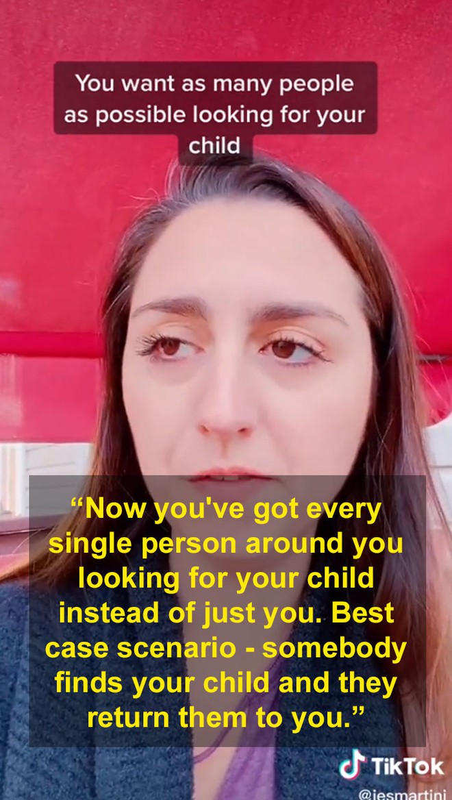 Lúc dần tuyệt vọng nhận ra rằng việc tìm kiếm con trong thầm lặng như thế sẽ chẳng đạt được kết quả gì cũng là khi cô nhớ lại lời khuyên của Jess Martini trong video chia sẻ mẹo tìm trẻ đi lạc mình từng xem trên TikTok thì liền làm theo.