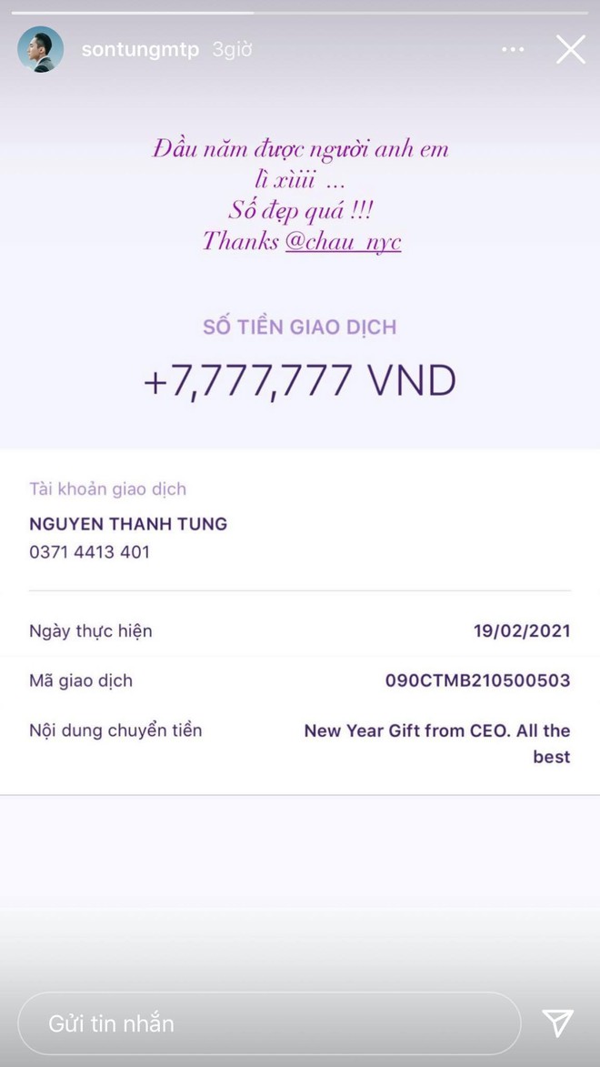 Trong một diễn biến khác, cả Sơn Tùng M-TP và Thiều Bảo Trâm đều xuất hiện trên MXH và vui vẻ đăng ảnh bên gia đình. Riêng Sơn Tùng, nghe đâu "Sếp nhà người ta" mừng tuổi mỗi nhân viên 7 triệu đồng lấy lộc đầu năm, chắc Hải Tú cũng nằm trong danh sách này nhỉ? Ngược lại, nam ca sĩ cũng hào hứng khoe ảnh được nhận lì xì 7.777.777 VND.