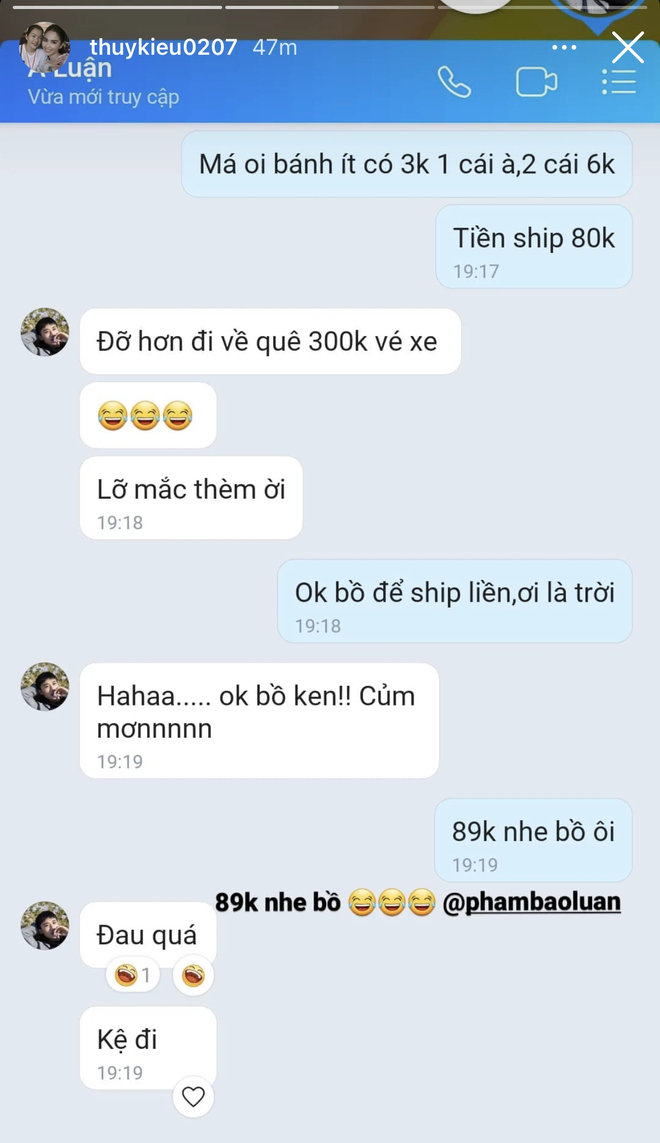 Về phần mình, "shop bán" Thúy Kiều cũng rơi vào tình cảnh dở khóc dở cười với anh shipper. "Em gửi rồi, anh shipper không tin đó là sự thật, anh hỏi em thiệt là gửi 2 cái bánh không em, có giỡn với anh không?", Thúy Kiều thuật lại.