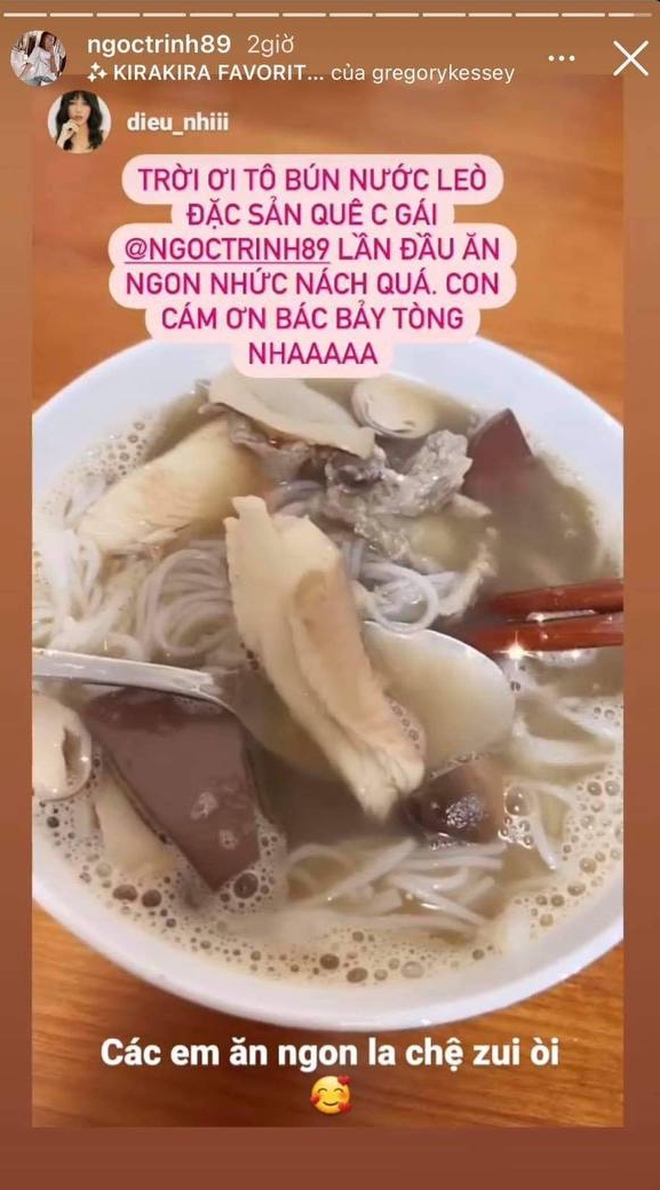 Trên Instagram của Ngọc Trinh lẫn Diệu Nhi đều đồng loạt đăng món bún nước lèo - đặc sản quê nhà của nữ hoàng nội y khiến không ít người tò mò về độ ngon của nó.