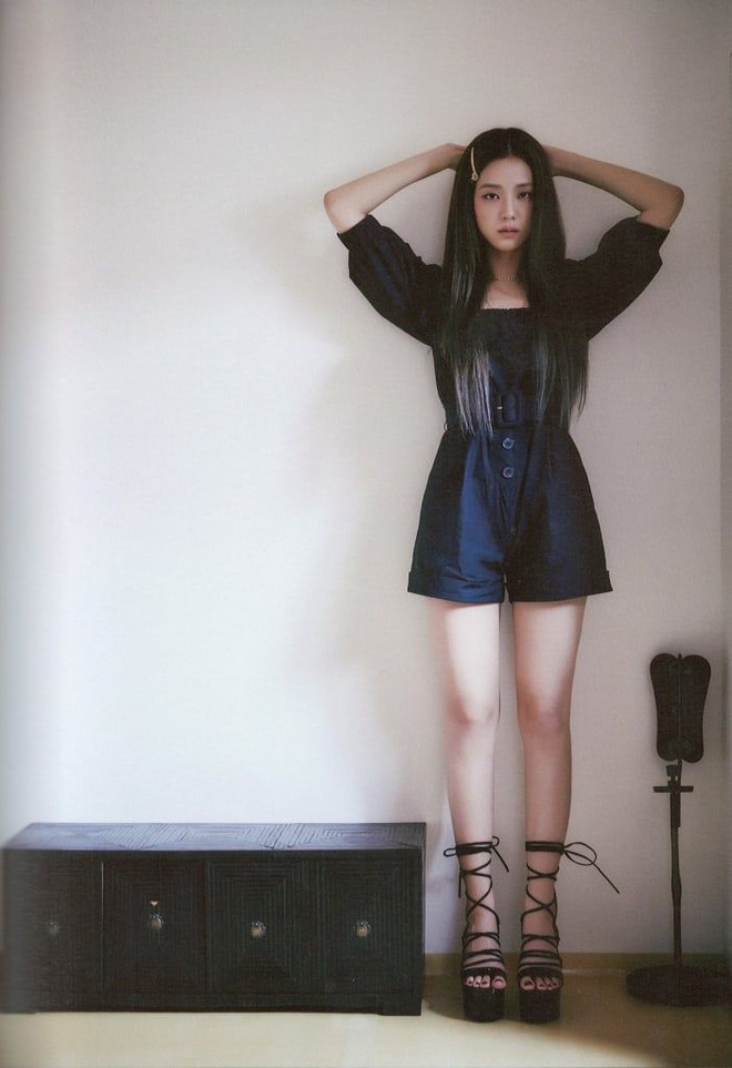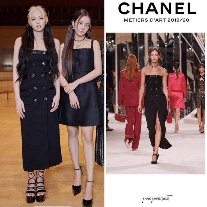 Jisoo và Jennie còn cùng nhau trổ tài đi cà kheo khi diện giày đế "khủng" buộc dây ấn tượng thế này. Một người mix váy dài + giày, nhân tiện quảng bá cho bộ cánh của Chanel, một người diện jumsuit ngắn để khoe chân nuột nà.
