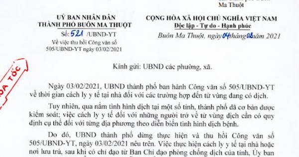 Do đó, UBND TP Buôn Ma Thuột thu hồi Công văn số 505/UBND-YT, ngày 3-2-2021. Việc thực hiện cách ly y tế tại nhà hoặc nơi lưu trú, sau khi có chỉ đạo từ Ban chỉ đạo Phòng chống dịch của tỉnh, UBND thành phố sẽ có hướng dẫn cụ thể sau.