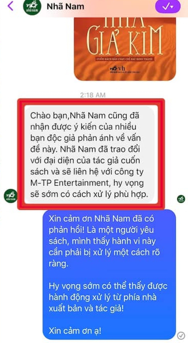 Không dừng lại ở việc nhắn tin cho Nhã Nam, một số bạn còn liên tục comment bày tỏ sự phẫn nộ trên trang Facebook tác giả Paulo Coelho, do đó đại diện của tác giả đã gửi mail cho Nhã Nam, mong muốn tìm hiểu rõ hơn về sự việc. Nhã Nam đã gửi thư chính thức theo dường chuyển phát nhanh đến công ty M-TP Entertaiment để chuyển lời tác giả, với mong muốn nhận được thông tin cụ thể hơn.
