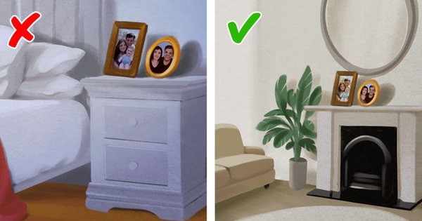 Tất cả chúng ta đều có xu hướng bày trí những bức ảnh gia đình xung quanh nhà, nhưng phòng ngủ là nơi tối kỵ theo phong thủy. Điều này là do nhìn ảnh gia đình vào đêm muộn có thể khiến bạn có những căng thẳng không mong muốn khi nghĩ về trách nhiệm của bản thân hoặc cảm thấy lo lắng cho các thành viên trong gia đình. Những bức ảnh của các thành viên đã qua đời còn có thể tạo ra tâm trạng tiêu cực và buồn bã khiến bạn thao thức cả đêm.