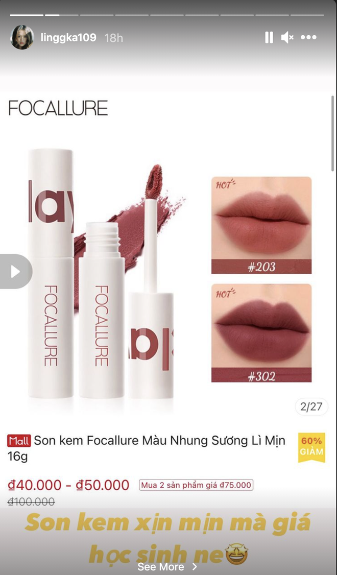 Nếu những thỏi son Xoài Non gợi ý giá vẫn hơi cao so với túi tiền của bạn thì Linh Ka mang đến bạn thỏi son mà ai cũng mua được vì chỉ có giá "tiểu học" khoảng 50k. Đây là em son kem lì với nhiều tông màu thời thượng có tên Focallure Mist Lip Mud và đang là sản phẩm bán chạy trên trang TMĐT đó nha!