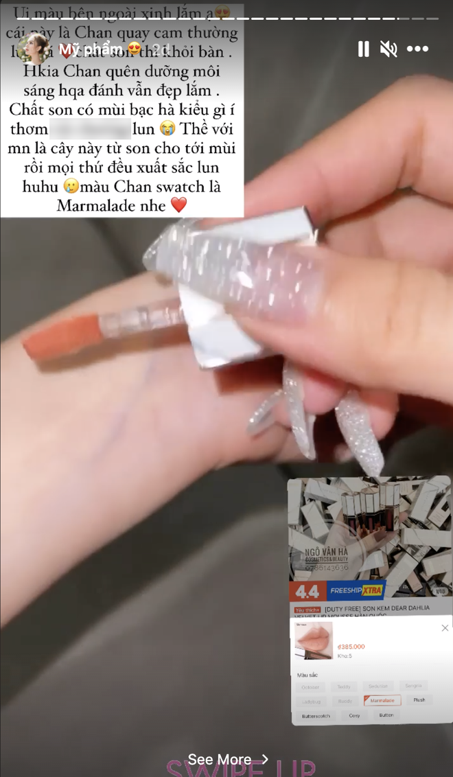 Series chia sẻ loạt son yêu thích của Xoài Non vẫn chưa dừng lại bởi cô nàng đã kịp tậu thêm son mới của Dear Dahlia. Dòng son cô nàng chọn là Paradise Dream Velvet Lip Mousse với màu cam đào Marmalade. Dựa trên review của Xoài Non thì đây là thỏi son cực kì đáng sắm vì từ màu son, chất son đến mùi đều xuất sắc. Tông son nhẹ nhàng, dễ đánh hàng ngày và có thể kết hợp với nhiều kiểu makeup khác nhau.