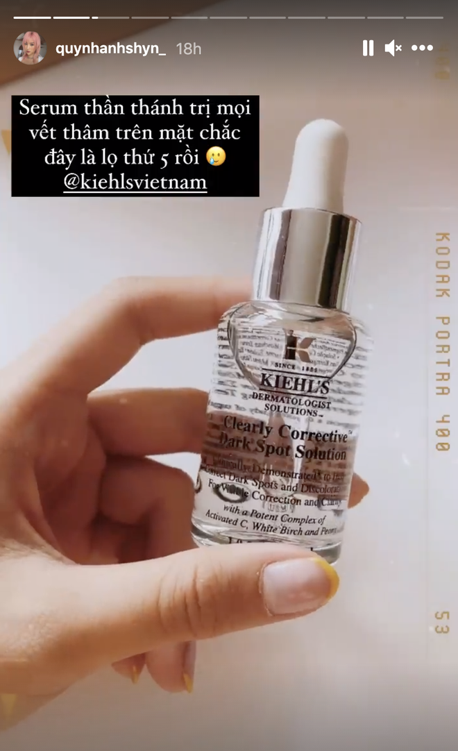 Trị thâm mụn quả là một chặng đường dài nhưng nếu chưa biết sản phẩm skincare nào hữu hiệu, bạn có thể học hỏi Quỳnh Anh Shyn. Mới đây, cô nàng chia sẻ serum trị thâm "chân ái" chính là sản phẩm đình đám của Kiehl's là Clearly Corrective™ Dark Spot Solution. Nàng fashionista khẳng định đây là serum thần thánh của cô và đã dùng đến lọ thứ 5 chứ chẳng ít.