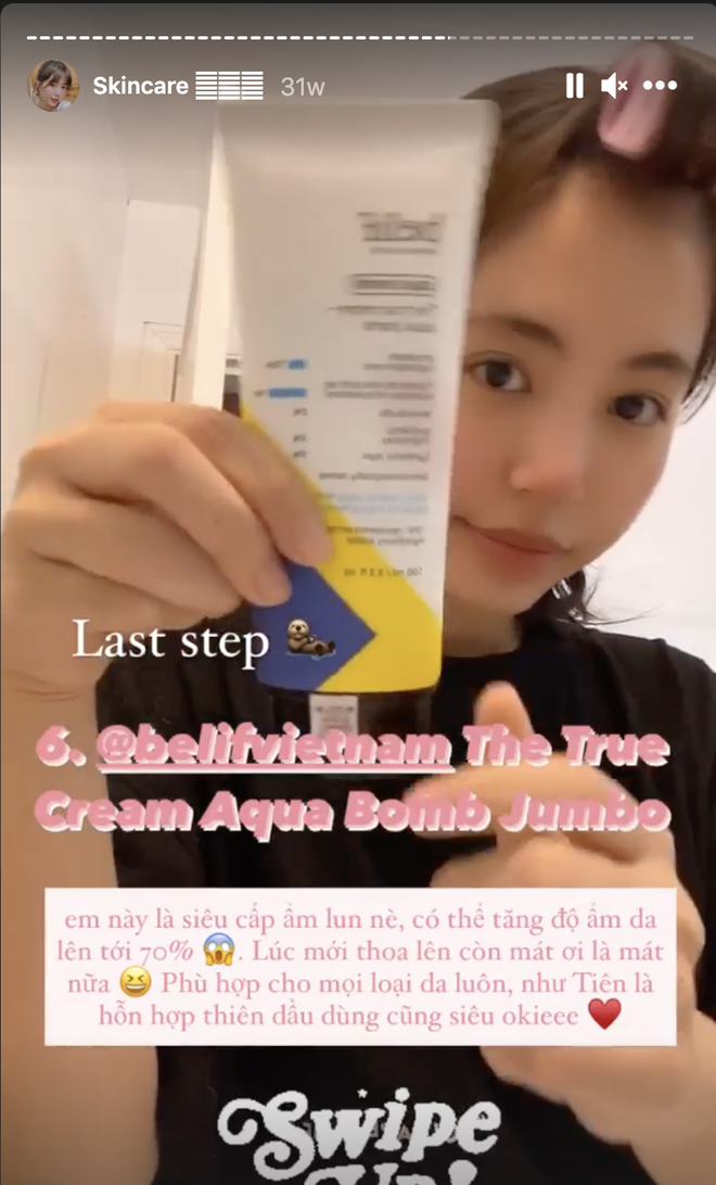Mẫn Tiên cũng là tín đồ skincare "thứ thiệt". Cô nàng thường chia sẻ những món skincare tâm đắc, trong đó có kem dưỡng siêu cấp ẩm Belif The True Cream Aqua Bomb. Theo lời Mẫn Tiên thì em nó rất "được việc" vì làm ẩm da tốt, thoa lên da cho cảm giác mát dễ chịu, chuẩn với da hỗn hợp thiên dầu. Chất kem dạng gel trong màu xanh nhạt với hương thơm thảo mộc nhẹ nhàng. Kem được nhận xét là thấm nhanh, không gây bóng nhờn, giúp da ngậm nước, mềm mượt.
