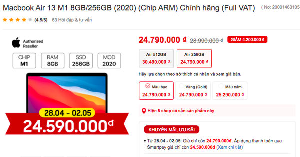 Chỉ cách đây khoảng 2 tuần, mẫu MacBook Air M1 của Apple vẫn đang được bán với mức giá từ 25,5 triệu đồng - 26 triệu đồng và trong những ngày lễ đang được giảm giá hơn 1 triệu đồng. Và mức giá giảm dưới 25 triệu đồng này chỉ áp dụng trong thời gian lễ nên nếu bạn muốn lên đời máy tính của mình thì cần tranh thủ "chốt đơn" sớm.