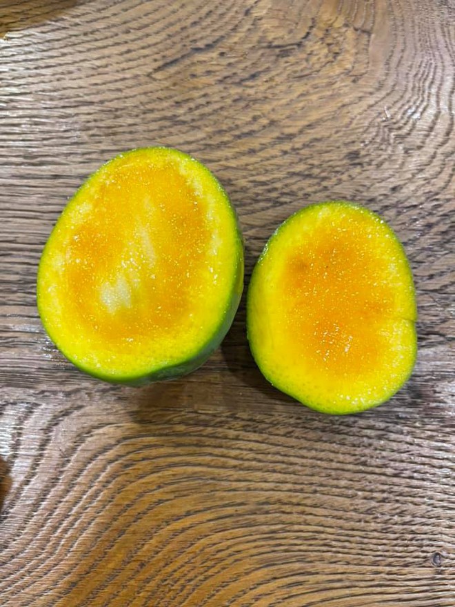 Nhìn trong ảnh, có thể thấy trái xoài đúng là… bé tí hon, đặt cạnh quả khác mà lộ rõ vẻ nhỏ bé và "yếu đuối". Ruột bên trong thì vàng ươm nhưng đúng là nhìn không giống xoài bình thường cho lắm?