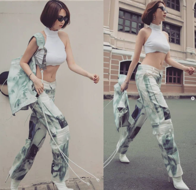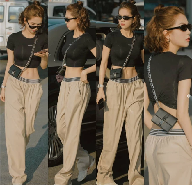 Phải công nhận rằng combo quần baggy/ quần thể thao rộng rãi kết hợp cùng áo croptop được Ngọc Trinh thể hiện khá thành công, nhất là khi cô khéo léo kết hợp cùng phụ kiện túi, kính mát và mũ phù hợp