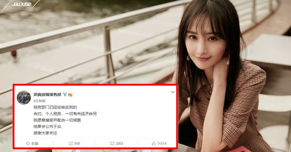 Lên top tìm kiếm suốt từ tối qua tới sáng ngày hôm nay, Trịnh Sảng cuối cùng cũng đã lên tiếng chính thức trên tài khoản Weibo phụ trách công việc. Cô viết: "Cục thuế đang kiểm tra hợp đồng, thuế thu nhập cá nhân và tất cả các hợp đồng kinh tế liên quan của tôi. Tôi sẵn lòng phối hợp với công tác điều tra của cục. Kết quả sẽ được công bố sau, cám ơn mọi người đã quan tâm".