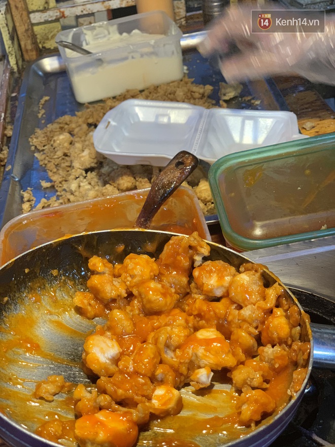 Chắc vì chiên số lượng gà lớn nên chảo dầu thoạt nhìn thì… hơi đen. Gà phải áo qua một lớp bột mỏng bên ngoài trước khi chiên nên cũng không thể đòi hỏi khu vực bán phải gọn gàng, sạch sẽ. Dù vậy, người bán vẫn đeo bao tay cẩn thận, gà chiên xong sẽ được đổ ra một cái mâm riêng. Khi khách mua loại nào thì mới tiếp tục cho vào chảo xào sơ với loại đó.